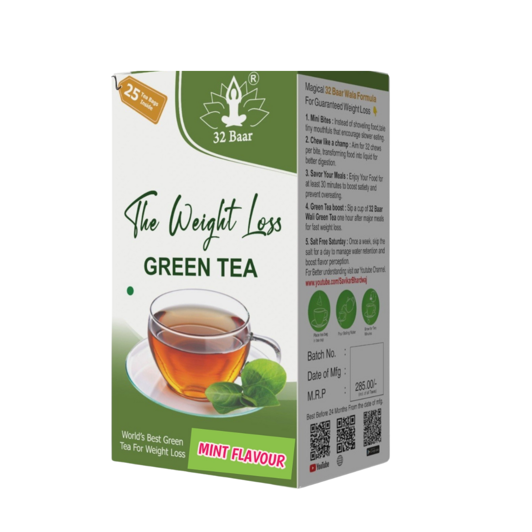 The 32 Baar Magic Pepper Mint Flavor Green Tea Bags comes with healthy instruction and guaranteed fat loss tips by Savikar Bhardwaj, who has so far helped thousands of people to loose fat with natural eating habits.